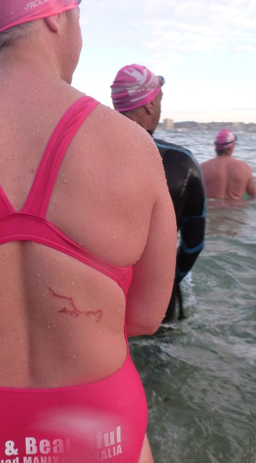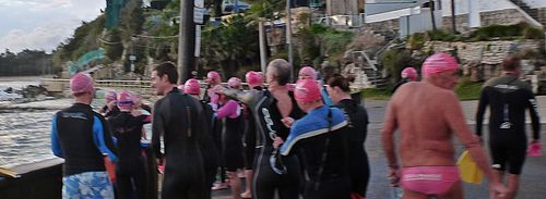 After a rolling all over the place swim – but enough to take your mind off the cold that’s for sure!! We all made it to Shelly – although I heard that some who went in from the beach said it took so long to get through it all they didn’t make it to Shelly and just turned back …some to half way and some back to the beach… The swell at Shelly had us rolling around too!