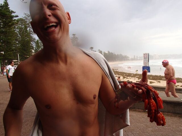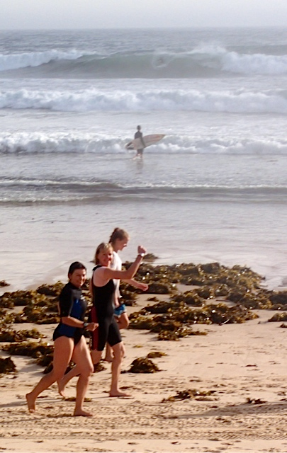 About half of us went out in the strong rip through the surf at the main beach, receiving a gratis seaweed exfoliation deluxe in return for their effort. Here’s Adam Moore looking cheerful in anticipation of this beauty treatment.
