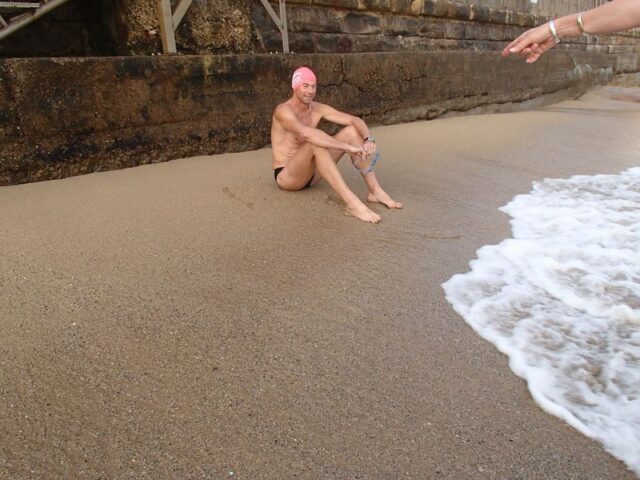 And what is everyone looking at? Possibly watching in absolute awe and amazement as Superwaterman, aka Drinky, aka Andrew Drinkwater (aha! drinking the seawater – therein lies the secret to his super aqua power), seemingly without any difficulty swim against the strong rip into the beach as everyone else was shooting straight out in the other direction.