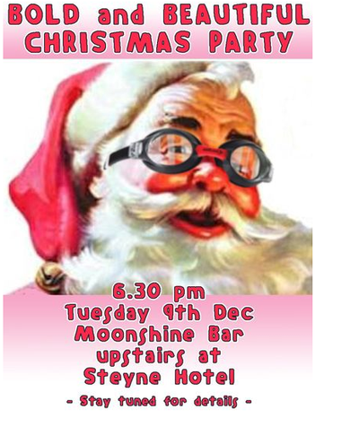 The B & B Christmas Party will be held on Tuesday 9th December at 6.30 pm in the Moonshine Bar (2nd Floor) at the Steyne Hotel. All swimmers and partners/friends are welcome. The theme this year is simply “Christmas“. So come dressed in your finest Christmas paraphernalia. No need to be shy as we will have the whole bar to ourselves. Finger food and pizza will be provided by the Steyne, and drinks will be at bar prices. Lots of fun and dancing are guaranteed, with music by our own band “The Troubadors“, who have generously agreed to perform free of charge for us on the night. The cost is $10 per head, with all proceeds going to the running costs of the B&B. Our charity partner, the Royal Far West Children’s Home, will also be running a monster raffle on the night, so please come prepared to support them. Bookings are essential. Book HERE now! Don’t miss out on this fun event, numbers are limited.