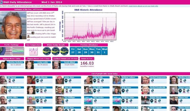 Come on folks – this is the most efficient way to capture your swims.  It’s a smart phone friendly website so no need to download, just mark it as a bookmark.  There are so many good reasons to use the B&B Login – like no queues, no need for glasses to find your name, and never missing the 7am call.