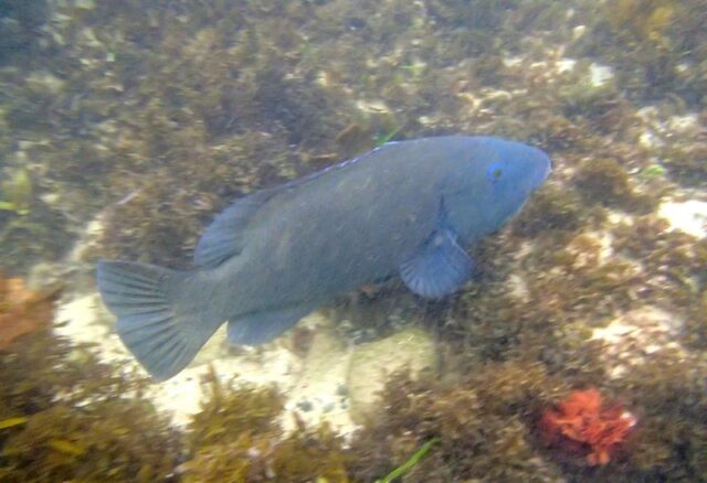 Swimming close to the rocks I see a lot of blue gropers, mados, yellowtail and this lovely crimson morwong having a feed.