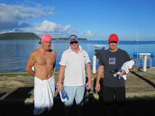 Below photo are B & B swimmers: Graham Kent (in B & B cap), David Walton & Hamish Shearer who all competed in the event below in Port Villa on Saturday 28 May 2012.  In the background is Iririki Island, the venue for a 3.2 k swim on 9 June 2012.