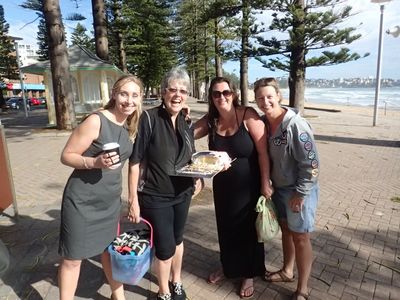 Reliving the swim at the benches has become a ritual. Did you know this was started by the lovely ladies who called their bench The Table of Knowledge? Vicky is one of this delightful mob. She is also the amazingly generous person who sponsors our pink caps. Today she had a cake to mark a special celebration – she is getting married in two weeks’ time.