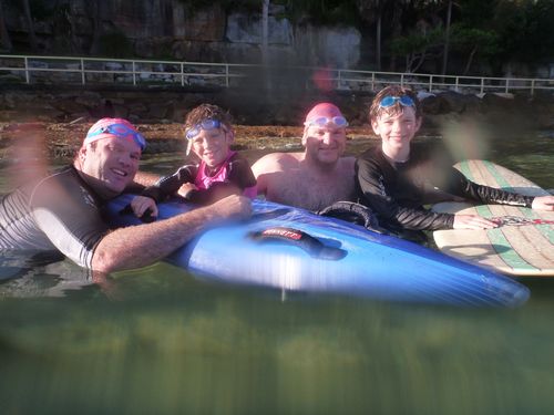 These two juvenile humans aged 9 and 11 (Ben and Riley?) are lovlingly introduced to the wild seas of the bay by their fathers. Other offsprings spotted today were Michael R’s nephew John (11) and niece Ella (12). They were swimming too fast for today’s blogger to snap a photo of them, but hopefully next time.