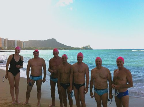 Talk about a small world. Two of our swimmers from America, Lynn Jolly and Mal Howard were taking a stroll down Wakiki Beach where they ran into the Bold and Beautiful going out for their morning swim and took this great photo !! Congratulations to all our swimmers who took part in the Waikiki Roughwater swim, which are all those featured below plus Lynn Jolly and Annette & Paul Willows. Looks like you guys are all having a fabulous time.