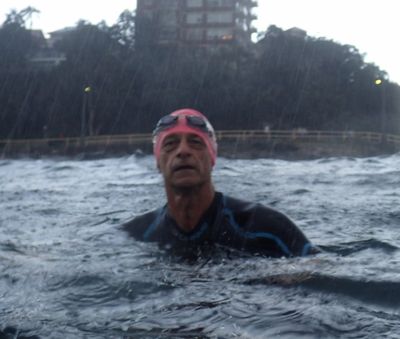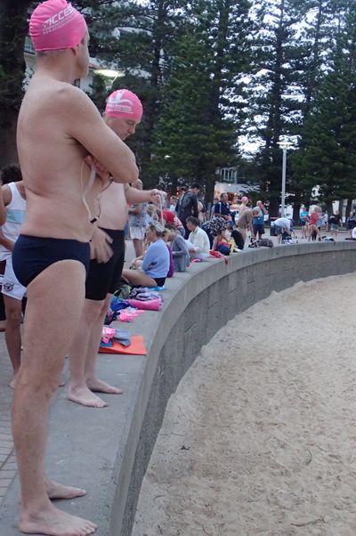 Mr Bond checks the conditions for the last time before the long swims.  The prospect of reduced visibility – due to rain – and swell from Queenscliff onwards had convinced him that maybe the way to go was for the swims to take place between North Steyne and Shelly.
