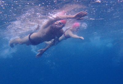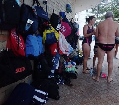 On the return the group splits into long distance swimmers, doublers, the speedy team heading for the showers and the rest of us meandering over rocks.