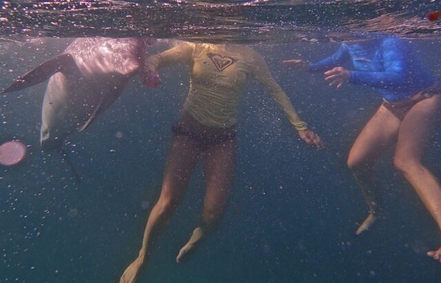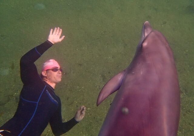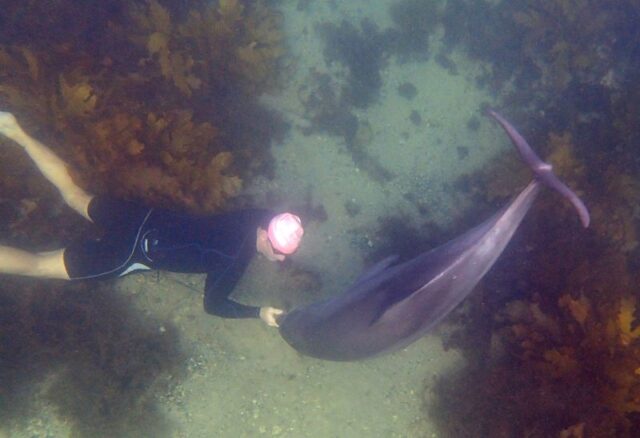 At Shelly Beach, Mauricio the experienced free diver who posted the beautiful video, dove down to the ocean floor, grabbed a rock and Silky came to him. Once again magical to watch…This dolphin seeks out humans after getting used to being with them at Sussex Inlet.She was captured and released in to a pod of dolphins but after half an hour swam away and has been joining groups of swimmers and surfers around Sydney ever since!