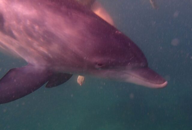 Silky, the lone dolphin hasn’t been around since Monday but I had to share my photos on today’s blog as I was lucky enough to be in the right place at the right time, (Cabbage Tree Bay early morning) on Sunday and Monday. Silky came right up to me as the photo below shows! More moments of AWE whilst doing a B&B swim!