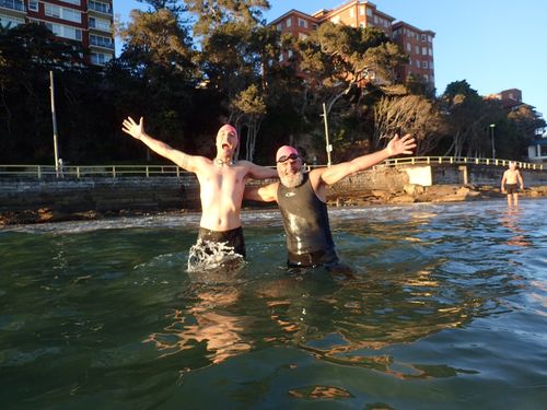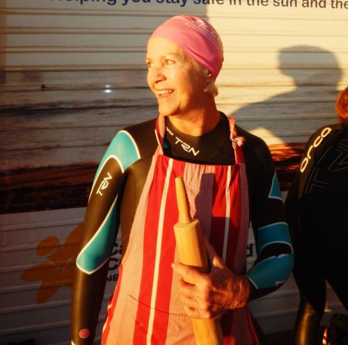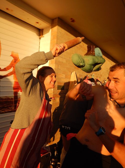 Rainer aka Lips was supposed to do the blog but swapped with me so he could give his wife breakfast in bed BUT he still managed to swim! Here’s Renae dressed ‘like a mother’ hitting Lips with a rolling pin..we all feel like doing that to him..