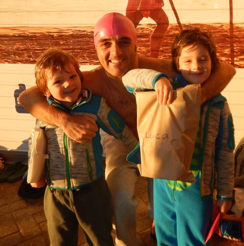 Here’s Nick with his really cute sons – they are waiting for their mum to come back from swimming …holding their Mother’s Day presents for her..