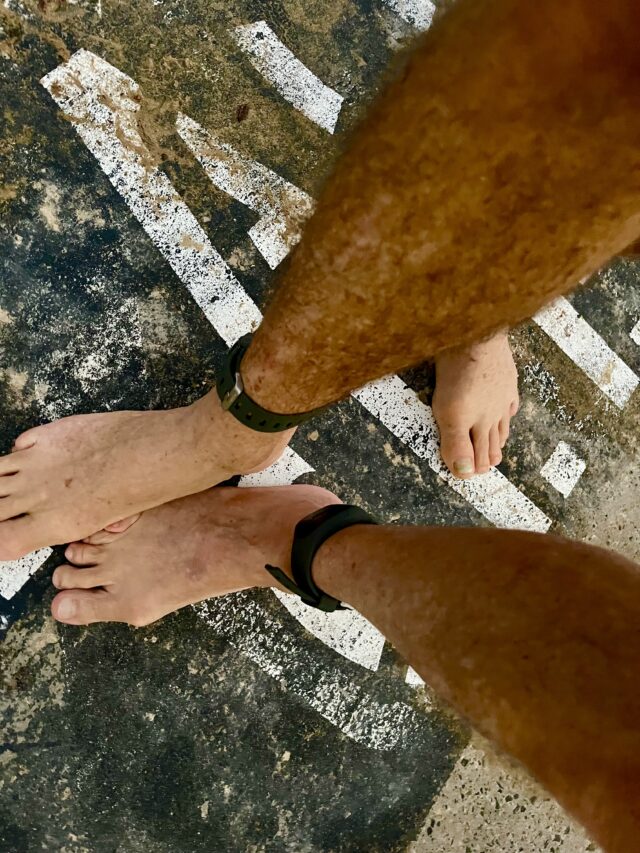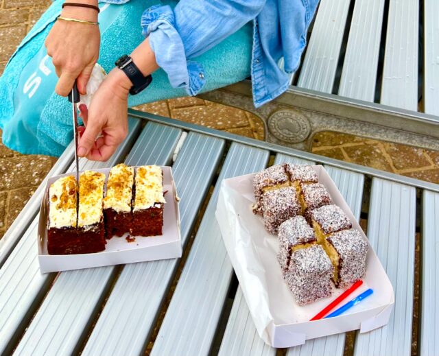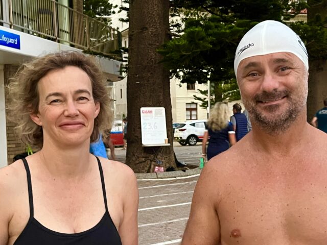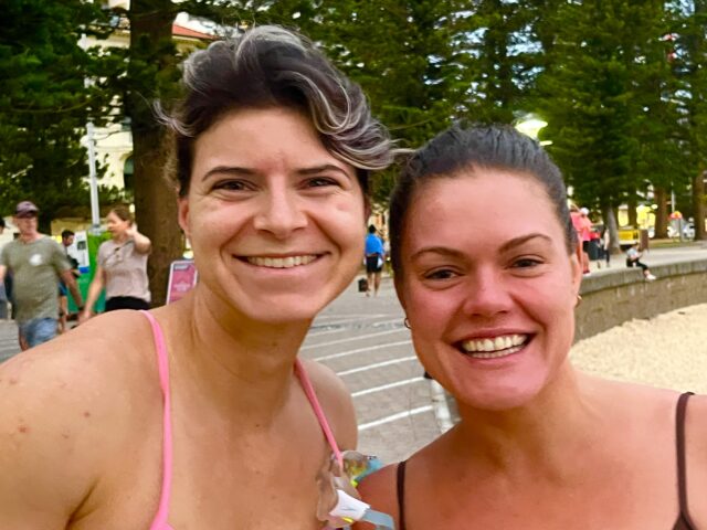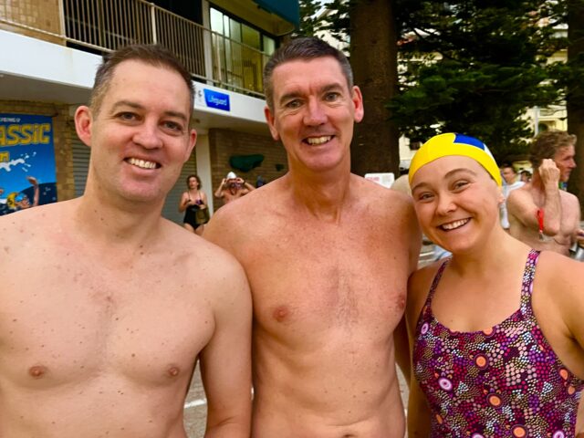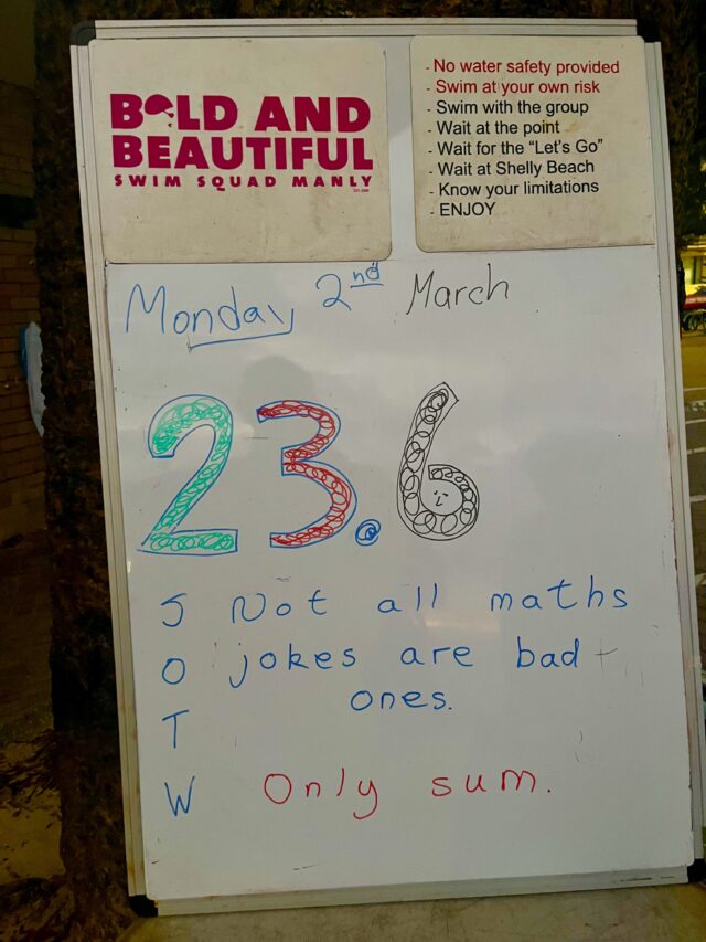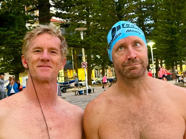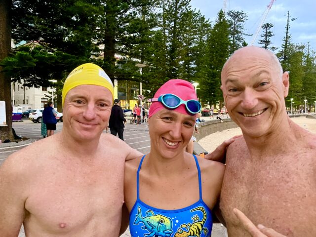 23 degrees warm in the water. Birthday Boys Brett & Chris swam north & to Shelly respectively.