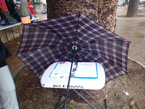 Umbrellas were the fashion accessory for this morning. Here’s Jill, still smiling smiling and meeting newbies.