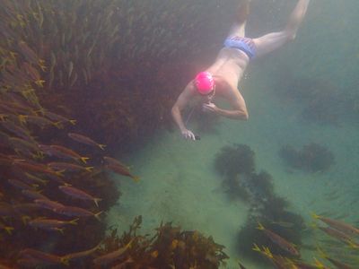 Love how you can be swimming along and there are fish on all levels. The mullet really close to the surface, garfish below and mados and silver sweep below.