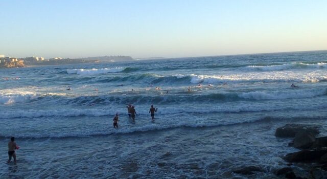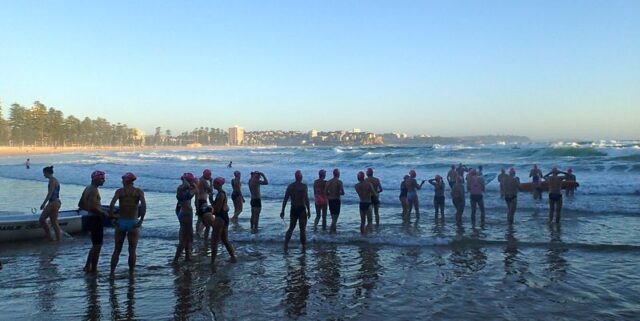 There was a huge group at 6.30am for The Drinks Express. Here the leader himself warns swimmers about the challenging surf conditions and advises them to go from Halfway if not really used to raging surf.