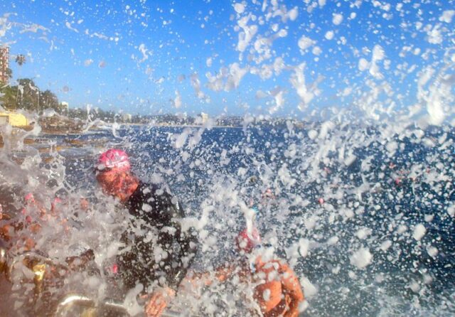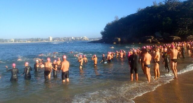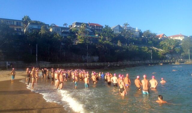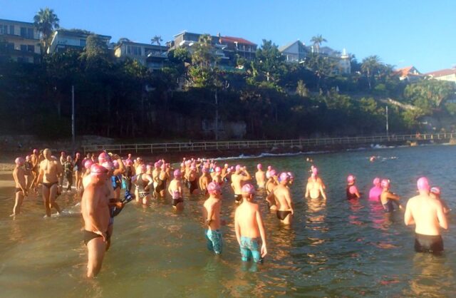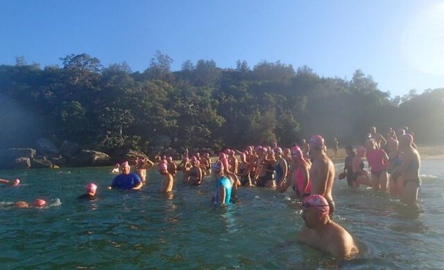 190 swimmers rose to the challenge today with the ocean showing us it’s wild and woolly side! Huge surf with waves breaking out far out towards The Point meant most of us chose the safer option and walked around to Fairy Bower. Waves were crashing there too but it all adds to the fun and excitement! I’ll begin with us all in the calm waters at Shelly Beach…