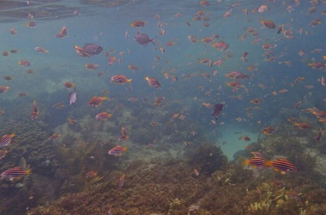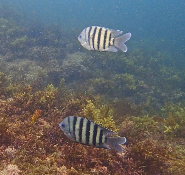 No fishy photos of today’s swim I’m afraid, too murky but I’ll just include a couple of earlier in the week. Bengali sergeants, a cute looking cobblerfish and swimming through schools of diamond fish and mados…