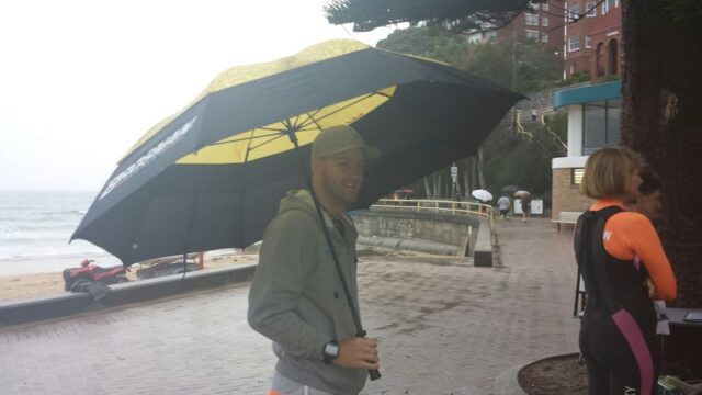 More swimmers were turning up this morning trying to keep as dry as possible until they head out into the waters. We are a funny bunch like that considering we are all going to get wet when we jump into the water. Check out the size of this umbrella. It’s amazing.
