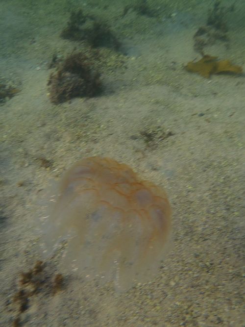 I am guessing that is the same species of jellyfish as the images you sent recently where you indicated the bell was up to 1m wide. It’s tricky but I think that is a specimen of the lions mane or snotty jellyfish Cyanea. It doesn’t seem like a lot of the images that you will see of this because I think all the long, dense, fine tentacles that you would usually notice have been broken off. Apparently this is not uncommon (see attached information). Once you rule out the tentacles the size is right (rules out most other jellies usually encountered) and the bell is also right for Cyanea. We have a few records in our collection from Watsons Bay and Botany Bay but not many really. If any of your swimmers are brave enough and can get a specimen in a bucket of seawater and to the museum I’d love one for the collection. I’ll need a bit of warning to organise a container and preservative though.