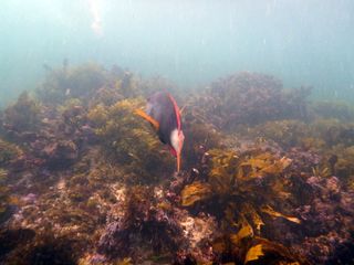 Sarah, that lovely fish is a crimson banded wrasse, female by the looks of things (grey body rather than grey with a patch of crimson by the tail).