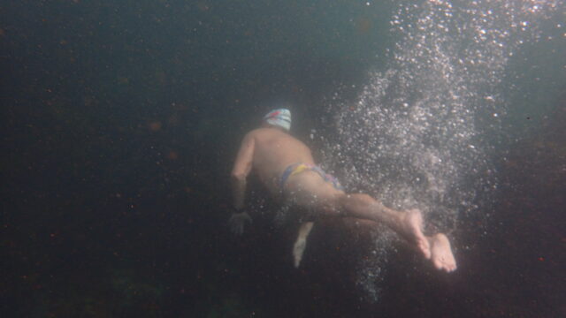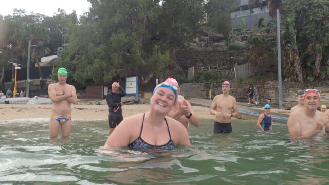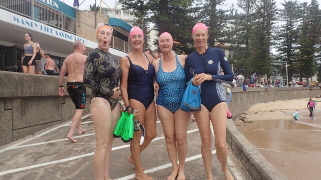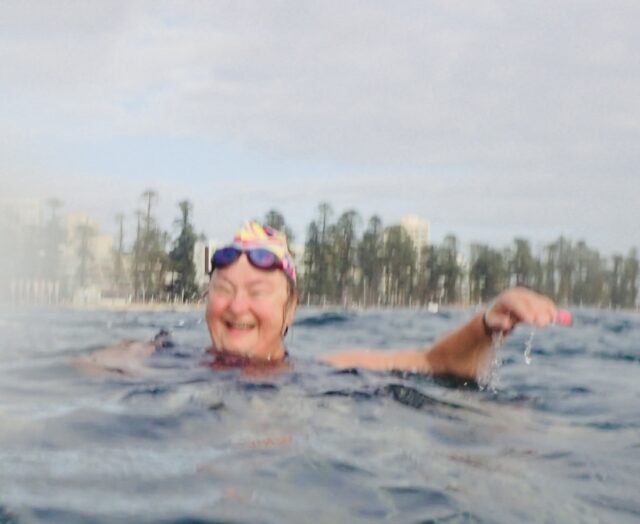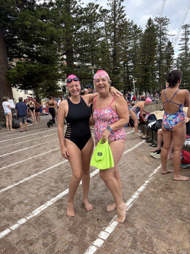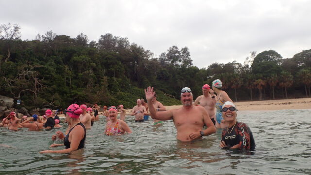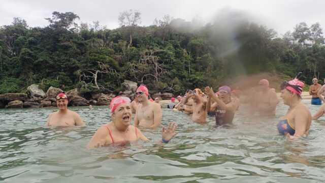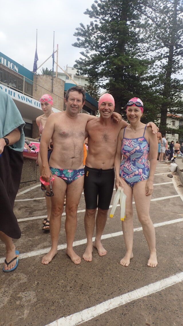 It was cloudy when I took this photo at 5.20am but it soon brightened up and was a lovely swim although viz was quite poor.Derek and Andre stop for a chat post swim. Andre had just ran 15kms through the bush! So many inspiring people at our swim.