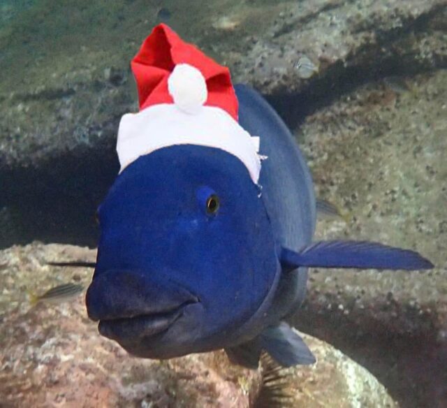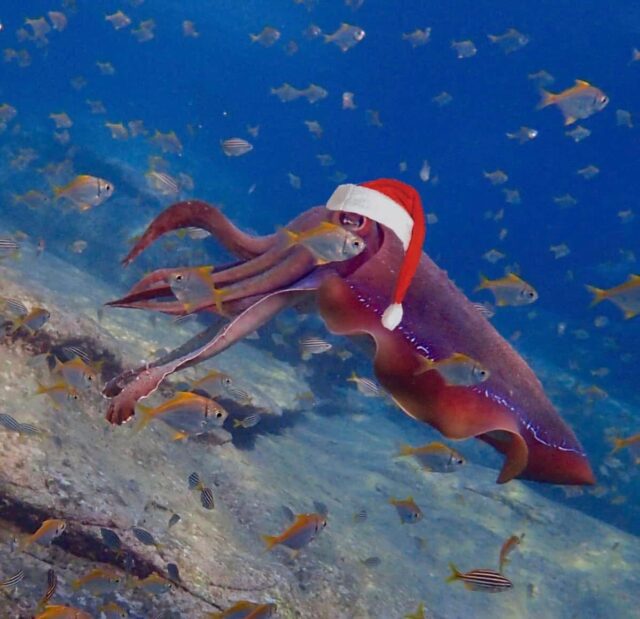 It was Dave’s 65th birthday today. Admittedly he does look good. Amazing we haven’t lost him as he goes out in the hugest of surf and has been known to say ‘I’d rather die than come in at half way’. He got a good soaking at Shelly!A very happy Christmas to all B&Bers. Hope to see lots of you around over Christmas. On the 25th it’s lovely to bring a plate of something to share and wear something a bit christmassy. Hope you like my Old Wife above. It was hard to see them today.I made Xmas cards one year and added Santa hats to a few of my best photos. So here they are!