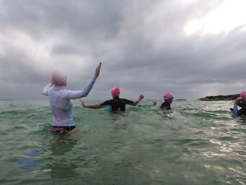 Cae dries his wings as Elaine and Jules M collect hugs before we swim back to enjoy our well earned coffee together.