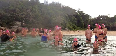 At least 110 Pink Capped swimmers swam today on a warm Summer morning in 20.3 degree water. Hardly anyone went from Halfway as the ocean seemed quite calm but most of us encountered a big set of waves as we headed to The Point. You had to dive deep under those waves and not panic. We love our challenges at the B&B!