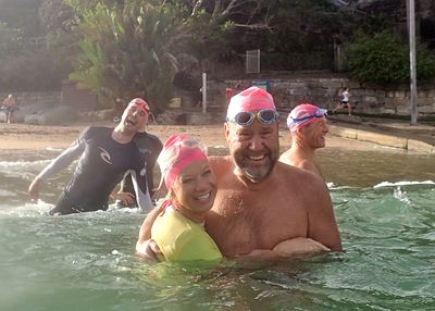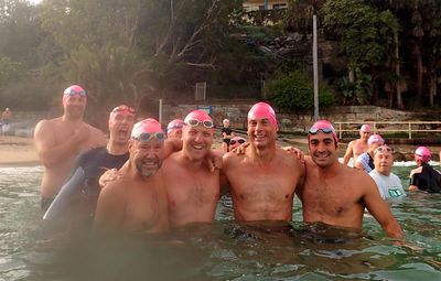 At least 110 Pink Capped swimmers swam today on a warm Summer morning in 20.3 degree water. Hardly anyone went from Halfway as the ocean seemed quite calm but most of us encountered a big set of waves as we headed to The Point. You had to dive deep under those waves and not panic. We love our challenges at the B&B!