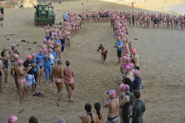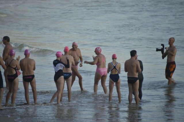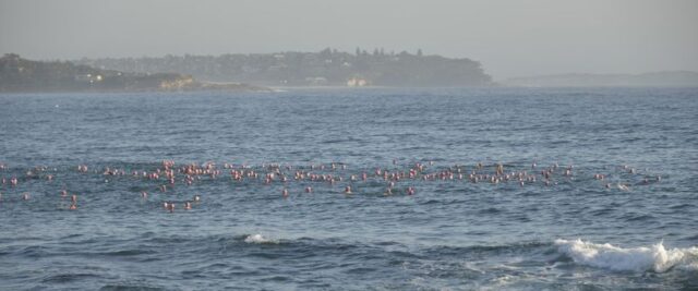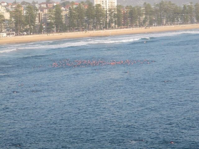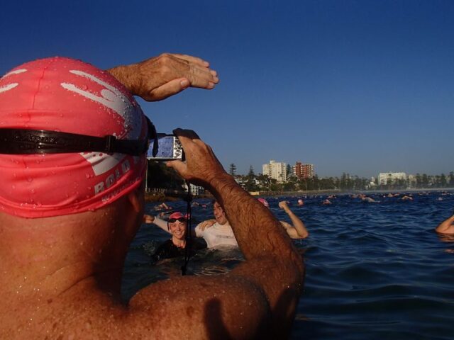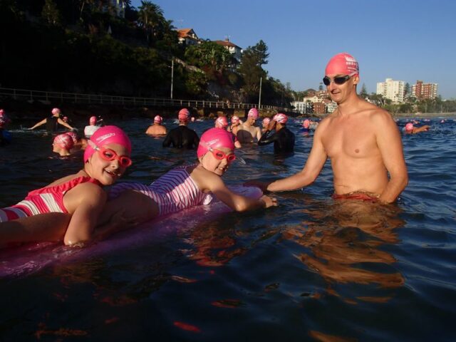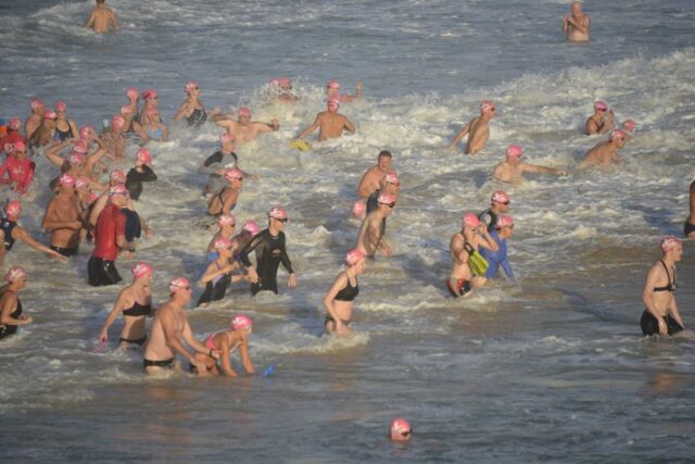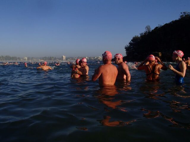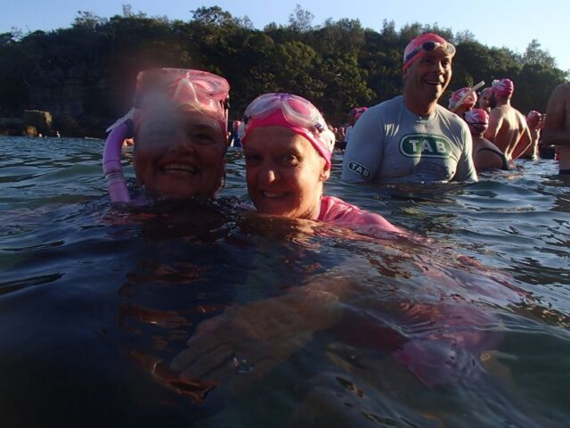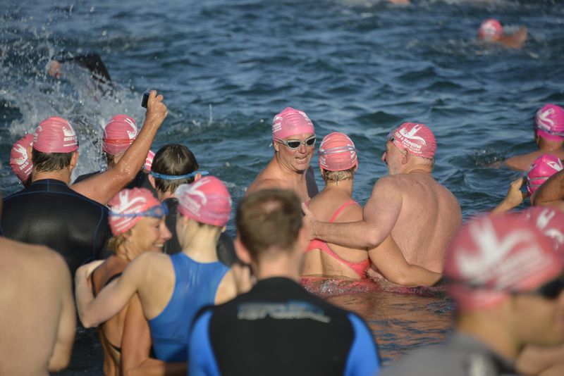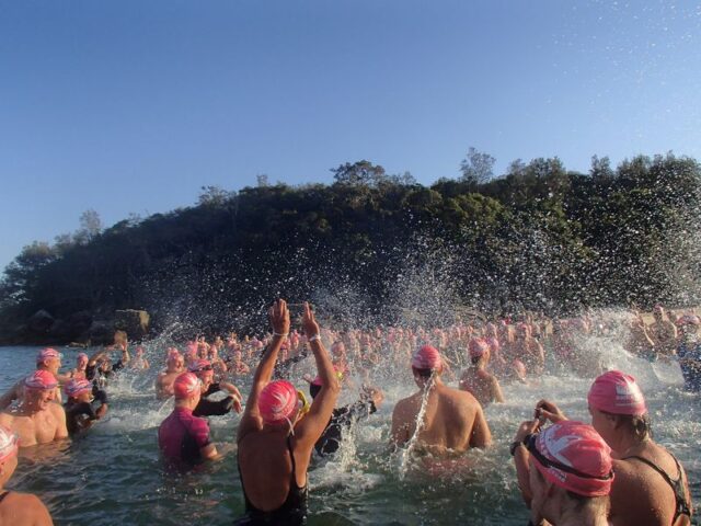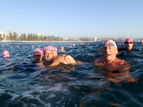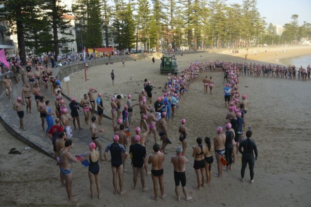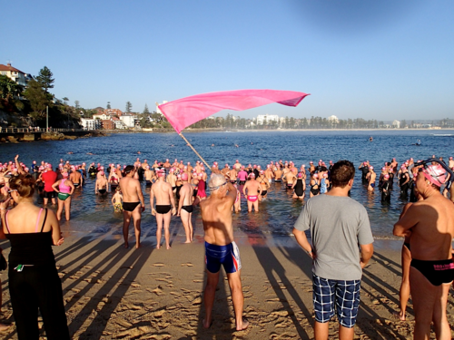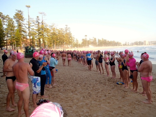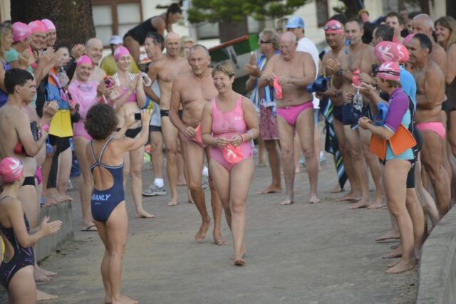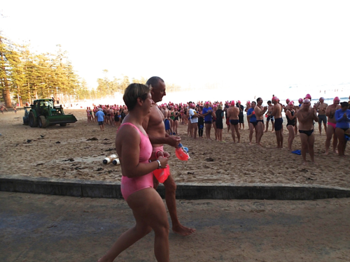 How gorgeous and appropriate to see Michael and Julie walk through the Pink Cozzie Guard of Honour to start off this morning’s swim, captured by a plethora of assorted photographers and paparazzi, including one of the best from Manly Daily, Simon Cocksedge.