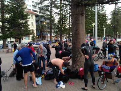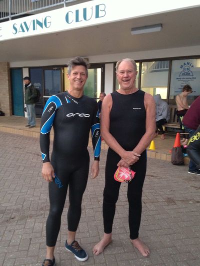 Mornin’ all. MEFF inner westies here. Yes, it was cold this morning …7 degrees. But the water was warm … 18-19ish. There are too few hours today – being the shortest day of the year – so the dedicated BnBers made the most of every minute! Activities included wetsuit wrangling, shivering, posing, congratulating, and a bit of swimming. Photos below reveal all.