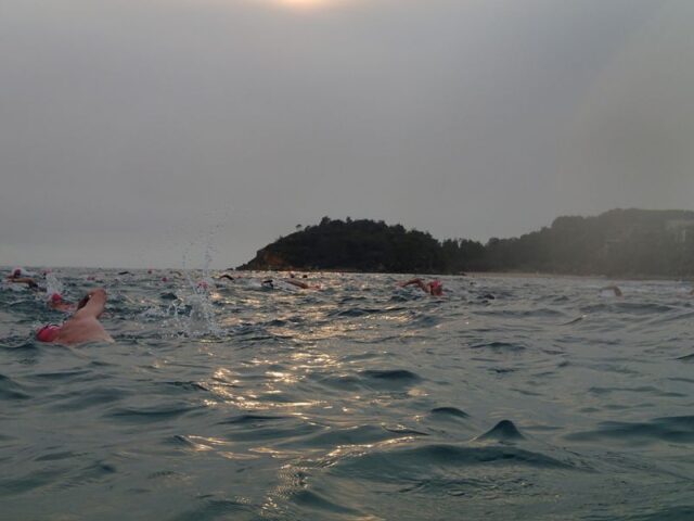Some of the early lappers take to the waters.