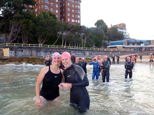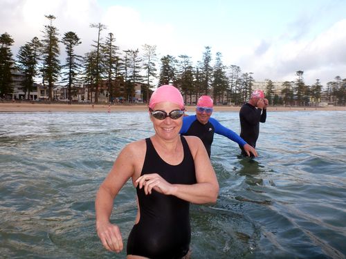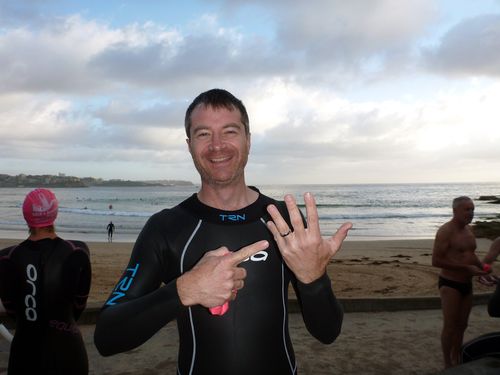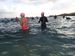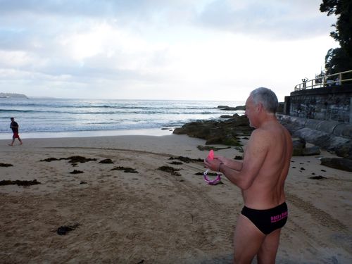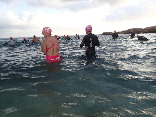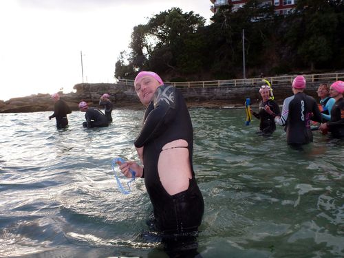 Look at me, look at me !!Β Stephen took these photos, I’m guessing at the point on the way back.Β How beautiful is the water ! It’s no wonder 5 swimmers continued on for a double.Β There were some early birds too, not sure how many though.