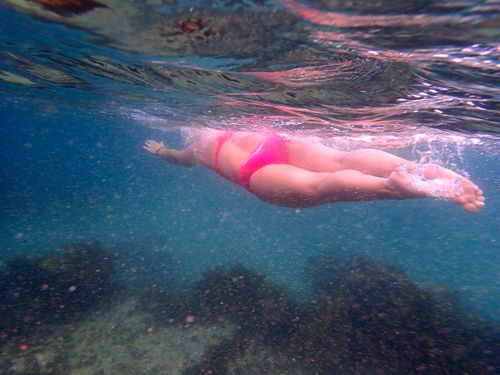 Just as we swam out to the point, there was a whale breaking the surface on the horizon.Β There were lots of them, full body breaching, as we walked home after brekkie too !!!Β Spectacular πΒ Closer tomorrow please Mr & Mrs Whale !