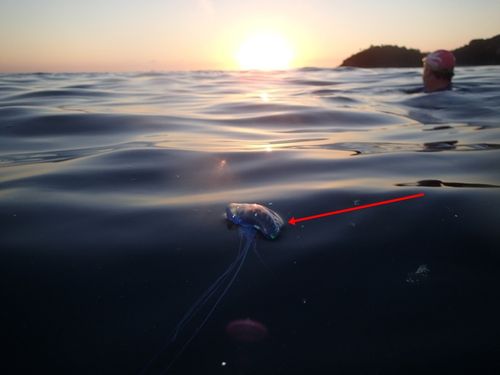 Hi Kim I got stung today…showed it to Ian who said it looked like a bluebottle sting. I’ve no idea as I didn’t see it. Did make me swim faster to the half way point tho!!