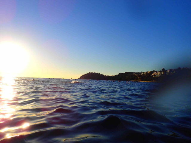 It was in fact just another glorious day and spectacular swim. We missed a big pod of dolphins that hit the bay 30 minutes after we got out. The day started like so many before but more and more light as the 6.45 photo shows. The waves we had on the weekend has all but left us with a 1m swell from the South East on a 9 second period. A gentle 4knot WSW wind gathered pace as the morning drew on but hardly raised a ripple. The 17.5 degrees of water temp was downright balmy after last weeks rude shock in the sub 16’s and the occasional check slap from the wall bounce into Shelley was the only evidence of any swell. A whisker off the high tide also made for an easy point crossing.