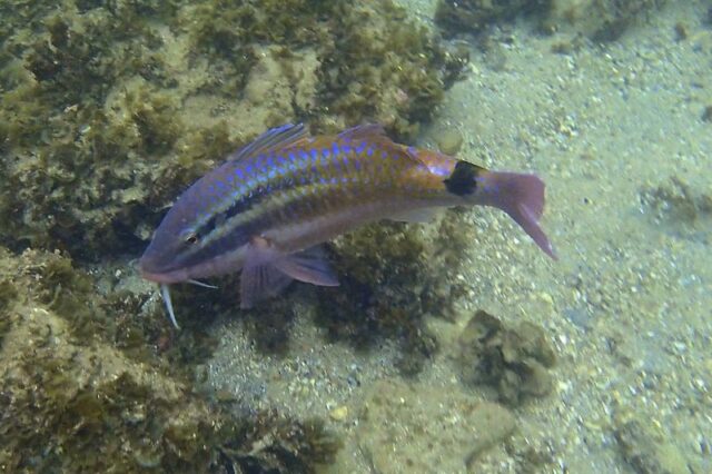 Perhaps their unpopularity among fishkeepers can be attributed to their feeding habits: Goatfishes are tireless benthic feeders, using a pair of long chemosensory barbels (“whiskers”) protruding from their chins to rifle through the sediments in search of a meal.[1] Like goats, they seek anything edible; worms, crustaceans, molluscs and other small invertebrates are staples.