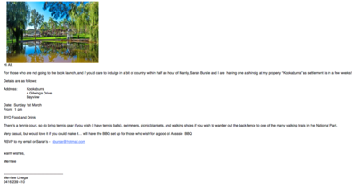 We’ve also all been invited to Merrilee and Sarah’s party at Bayview on Sunday afternoon/evening. (Quite a few of us are going straight from the book launch).Hope you can read the details above without a magnifying glass!