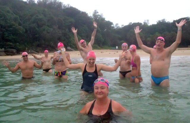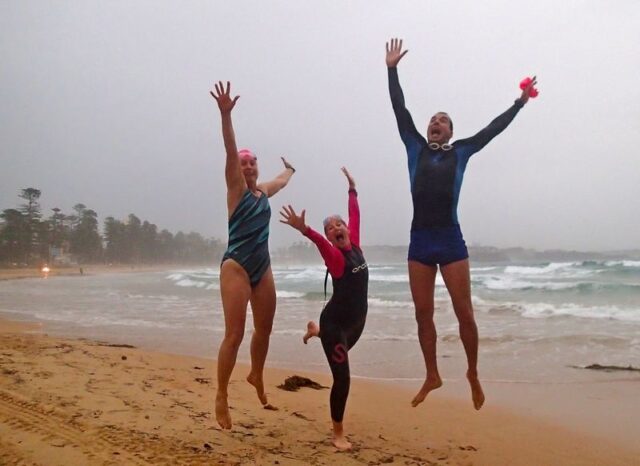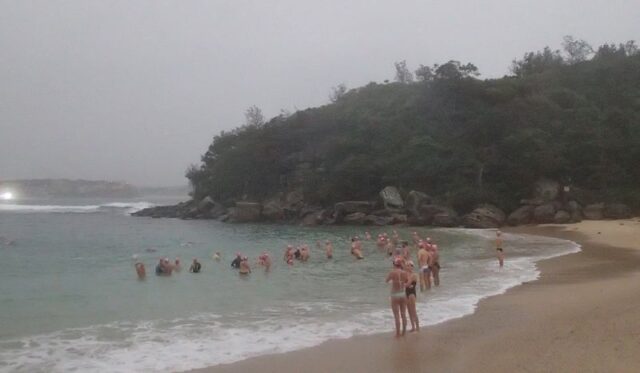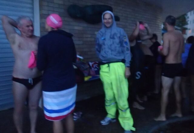 They say there is a ‘Man Drought’ in Sydney but there wasn’t down here at the B&B this morning! It was ‘raining men’ on a rainy, dull Thursday. (The first rainy Thursday I’ve had in my 16 months of blogging.) It was SO much fun though…with friendly, happy people, warm water and a few waves for a bit of excitement! JP and Rusty were the first to arrive at 6.25am…(Apart from bold LSA and Derek already in the water.)