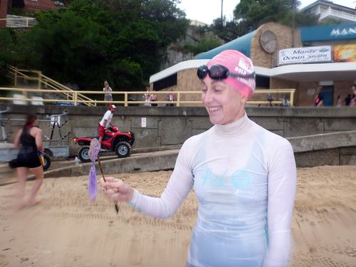 The mystery a) swimmer and b) wave catcher continues – if the b) is Jenny K, then she’s changed her wetsuit. As Manly’s Top Model contestant yesterday, she was modelling the sleeveless number. The wave catcher is modelling a full wetsuit!