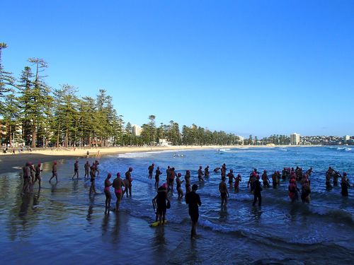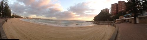 I missed the very brave Bolderdashers swimming to Queenscliffe at 5.40am led by Little Sarah.A good panorama of early morning Manly beach though.