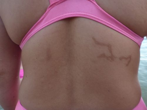 What was on everyone’s mind this morning? Well apart from the realisation that we are the most blessed creatures on Earth to be swimming right here every day in the company of good men and women, we were thinking about how to avoid getting that most dreaded kiss of them all; from a bluebottle stinger. This permanent road map of inner city Perth was indelibly etched into the lovely backside of Julie last season by a bluebottle with attitude.