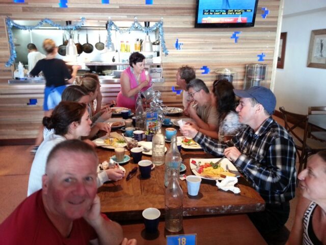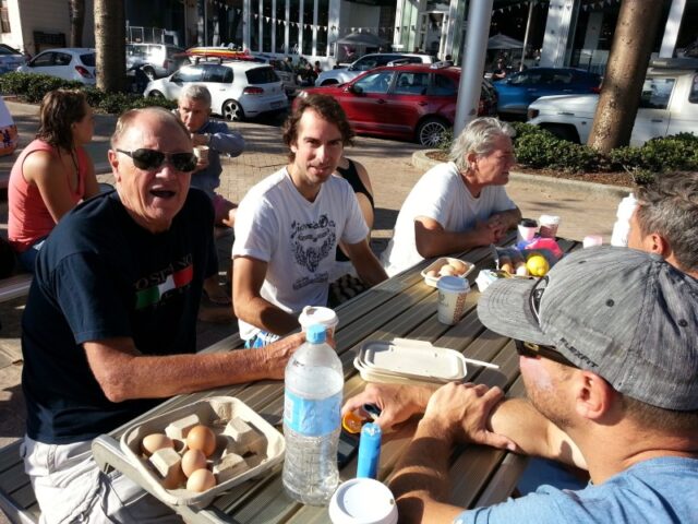 At 6.03 Clare, Jordon, Mark and I went in pursuit of Sterling and Sophie who left at 5:58 but we never saw them again until they turned up at the table of knowledge. At QC Mark returned as he had to go to work. The remaining 3 went on to Freshie then headed for home with Jordon taking a long s snake track route to catch the on shore drifts. We took a break at the club house to find Claire’s sister Ally as Jordon went home for babysitting duties. The remaining 3 took the scenic route to Shelly, meeting Lesley near the pool. We finally returned to Manly at 7.55 completing the 6k in less than two hours – not a bad workout as part of Claire’s preparation for the 20k Rottnest swim in Feb. Aprรจs swim, enjoyed Claire’s famous brownies, with strawberries, at the table of knowledge.