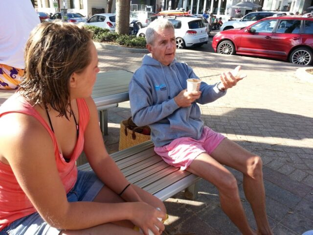 Jeff reminiscing, telling the younger swimmers how hard the swim was in the old days, before the ticking app made everything so much easier..