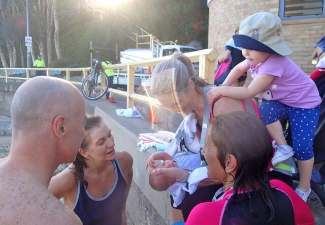 We gather together at The Point quite well this morning and wait for the last pink hat to get through the surf before the ‘Let’s Go.’ There’s a feeling of achievement after all that ducking and diving. Cam, Sam and Jam (Jules) are happy to be swimming!