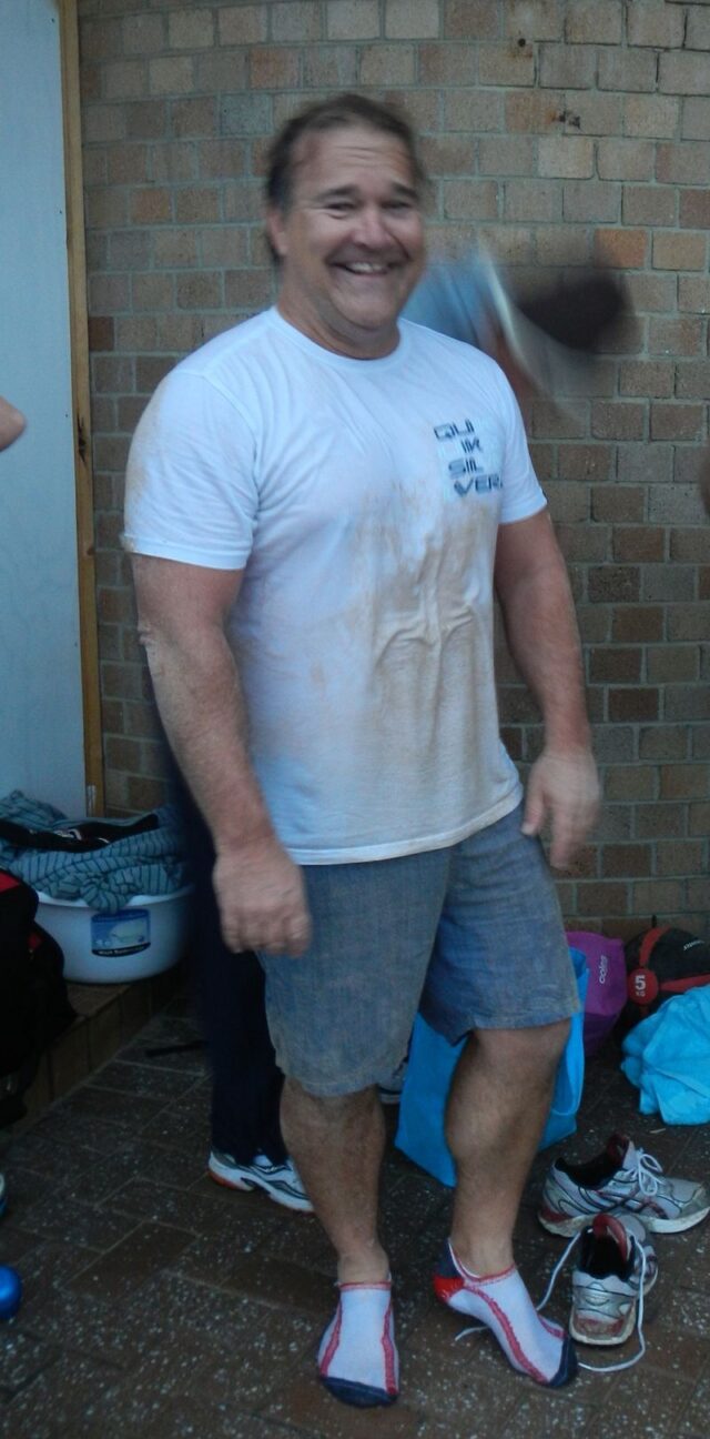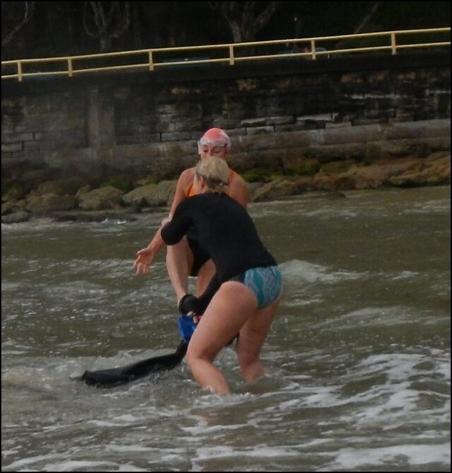 At Shelly: Dr John who is still yet to complete all his winter swims WITHOUT A WETSUIT has failed miserably!  He was in disguise and being very quiet but the integrity police spotted him!! 🙂