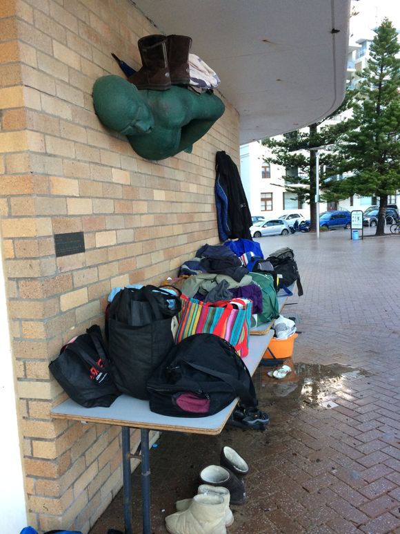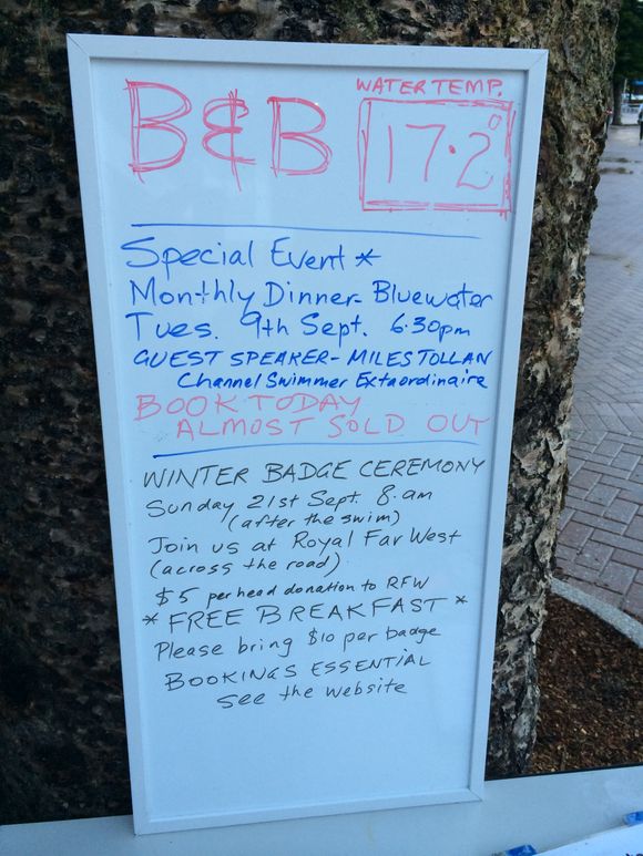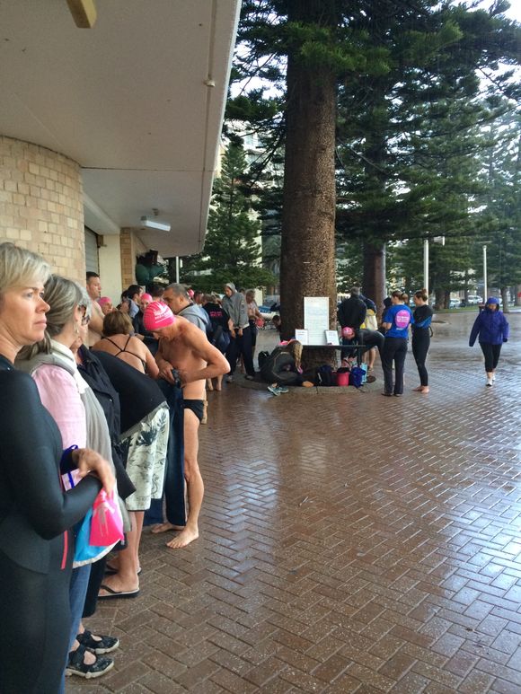 The photos below reflect the swim for 80 swimmers and 2 newbies (one had the biggest flippers I’ve ever seen), who braved the 17.2 degrees in the washing machine water. The first photo is a panorama shot from Manly to Shelley at 6.30 and if it turns out you can just see the early swimmers at the point. Next photo is a bunch going in. Then the table at 6.30 (how do we get the 7 am’ers on that ?). Second to last photo, the heavans opened at 6.55, great timing big feller.