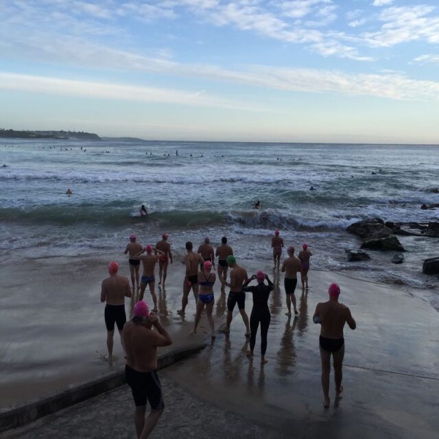 The 7am gang waiting at the point. The swim across to Shelly was a but “wishy washie” today with the increase in swell.
