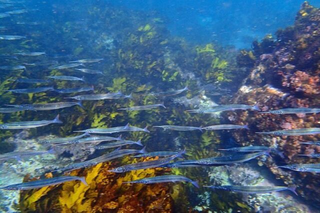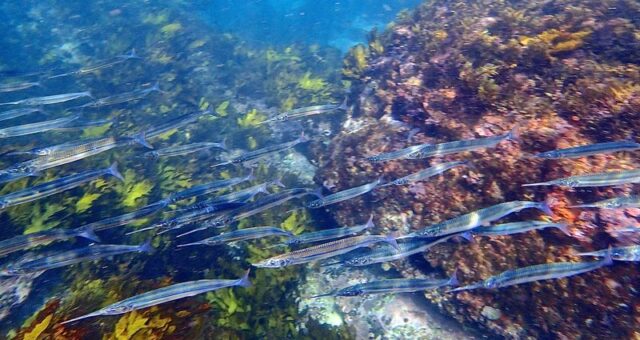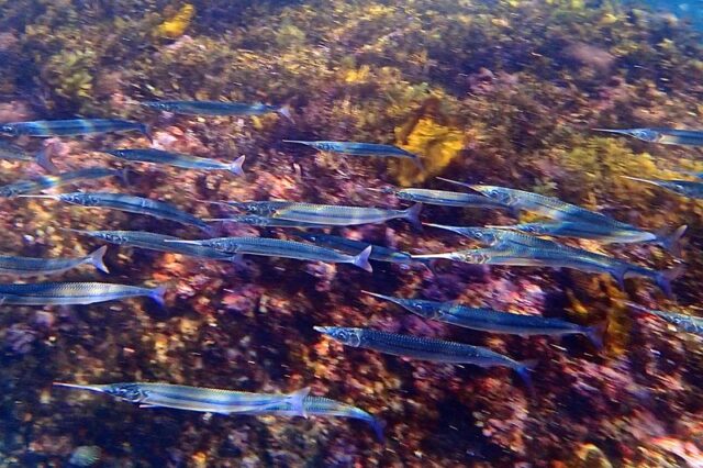 Garfish are Pelagic fish. The fish lives close to the surface and eats small fish, has a migratory pattern similar to that of the mackerel, arriving a short time before the latter to spawn. They move into shallow waters in April and May and spawn in areas with eel grass in May and June. In the autumn they return to the open sea, including the Atlantic west of theBritish Isles. Garfish are oviparous and the eggs are often found attached to objects in the water by tendrils on the egg’s surface.